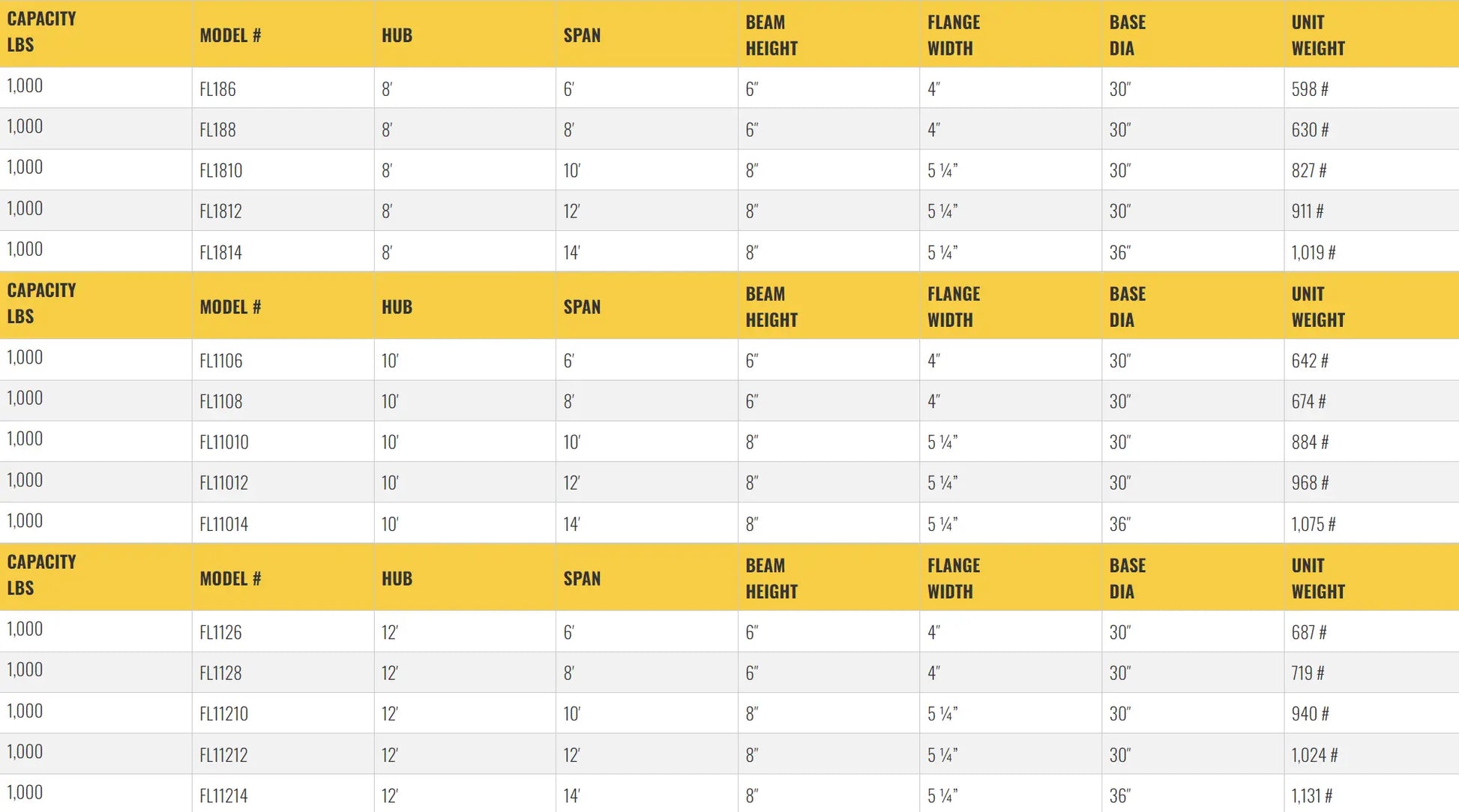 FL-1000 Series’ most impressive feature is its foundationless design. Unlike a traditional jib crane which needs a poured concrete foundation, the FL186 can be installed directly onto an existing concrete surface. This makes it perfectly reasonable for businesses which do not wish to spend time or money pouring a foundation, or facilities which might need to relocate (the crane) to various locations. On the base you can choose from two different sizes; a 30” diameter base, which has a 26” bolt circle, or a larger 36” diameter base with a 32” bolt circle. They both come with 12 spaces with 1¼” holes for anchoring to the concrete.