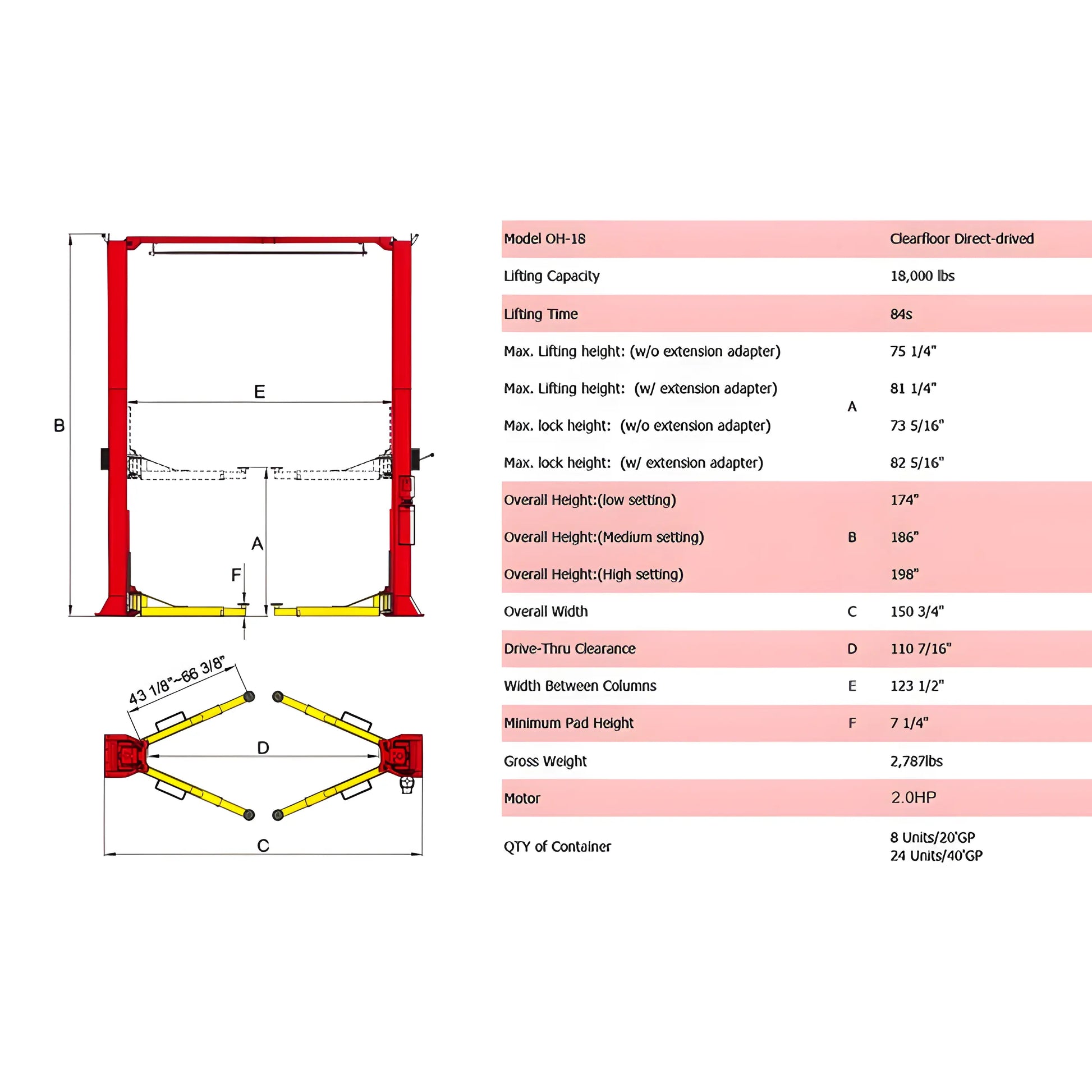 The AMGO OH-18 is a robust, professional-grade two-post lift built for high-capacity lifting. It supports up to 18,000 lb, making it ideal for heavy-duty trucks, commercial vehicles, and fleet maintenance. Designed with a clear-floor layout, it offers full undercarriage access and unobstructed workspace.