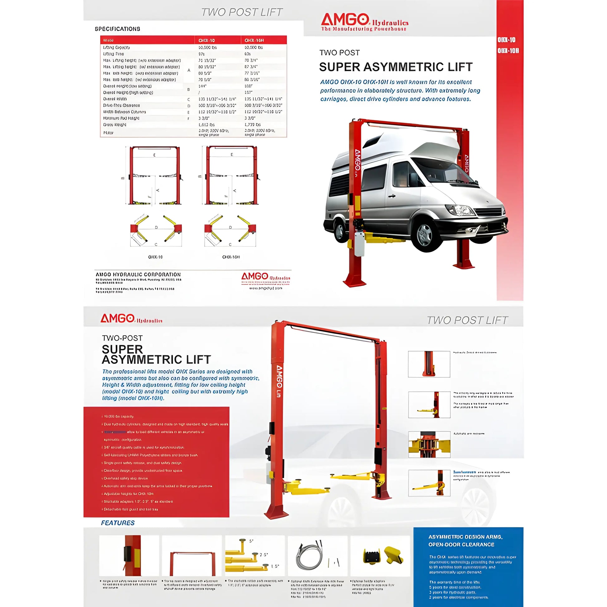 *Please REQUEST A SHIPPING FEE QUOTE before placing your orderThe AMGO OHX-10H is a heavy-duty, extra-tall 2-post lift with a 10,000 lb capacity, built for shops needing more under-vehicle clearance. Its clear-floor design and rugged construction make it ideal for reaching high undercarriage areas safely and efficiently — perfect for SUVs, trucks, and lifted vehicles.