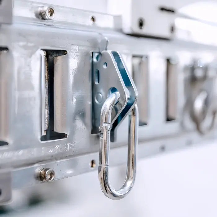 The heart of the system is the 5-foot galvanized E-Beam lifting frame, designed with industrial-strength snap-in slots every 2 inches for multiple connection points. This creates unmatched adjustability when securing awkward items of different shapes and sizes.