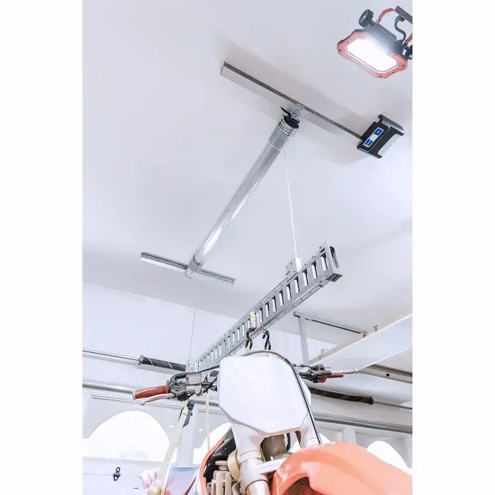 The Auxx-One 1400 is a powerful, single-motor overhead storage system designed to lift and store your heaviest, most awkward items with ease. Built for trucks, Jeeps, kayaks, rooftop tents, bike racks, canoes, hitches, and more, this compact heavy-duty lift removes clutter from your garage floor and secures it safely overhead—all controlled by a simple wireless remote.
