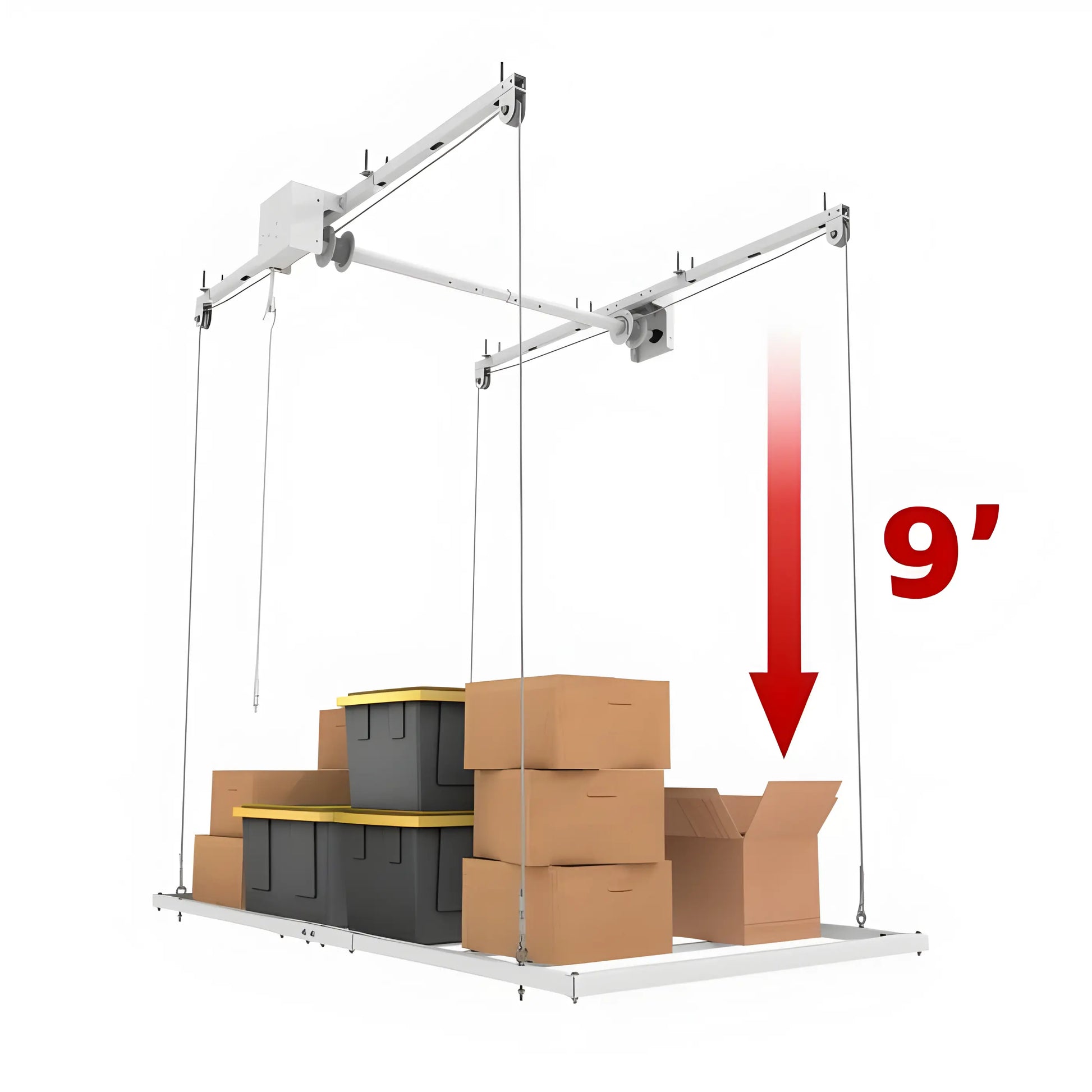 The EZ Lift also includes factory pre-assembled components, reducing installation time and ensuring a clean, straightforward setup. Once installed, the lift lowers up to 108 inches from the ceiling, bringing all your items to a comfortable height without climbing a ladder or hauling boxes overhead.