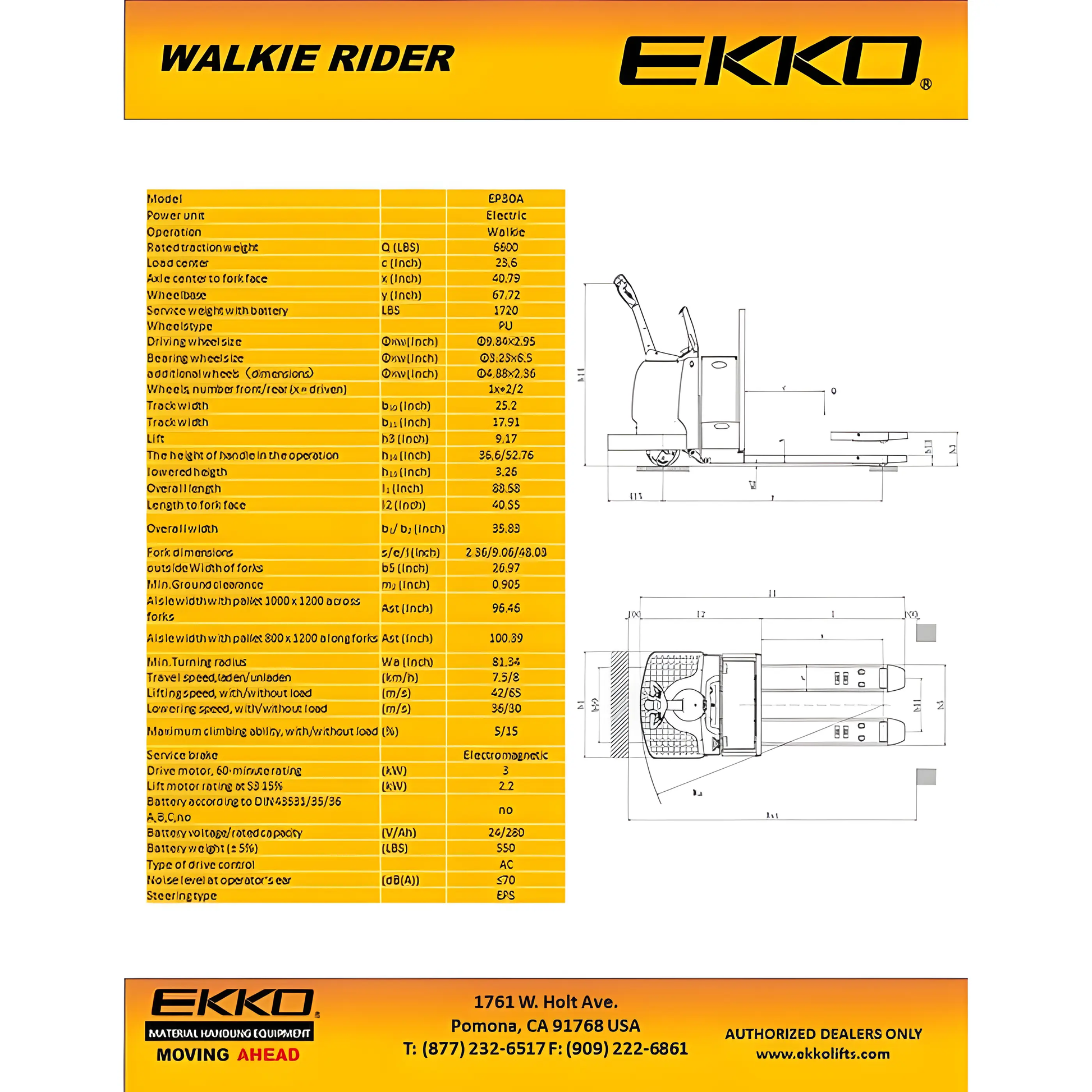 The EKKO EP30A Rider Pallet Jack is designed to merge the flexibility of a traditional pallet jack with full electric lift and drive capabilities. This makes it ideal for warehouses, manufacturing floors, stock rooms, and loading docks where fast, efficient material handling is critical. Its rider design enables operators to move pallets effortlessly over long distances, reducing fatigue and improving productivity.